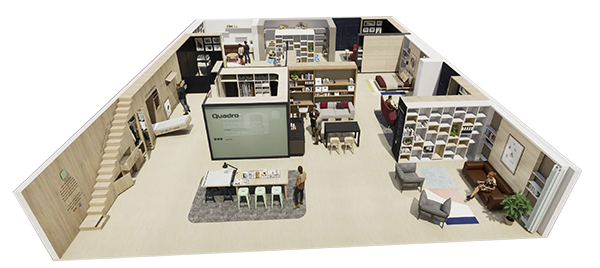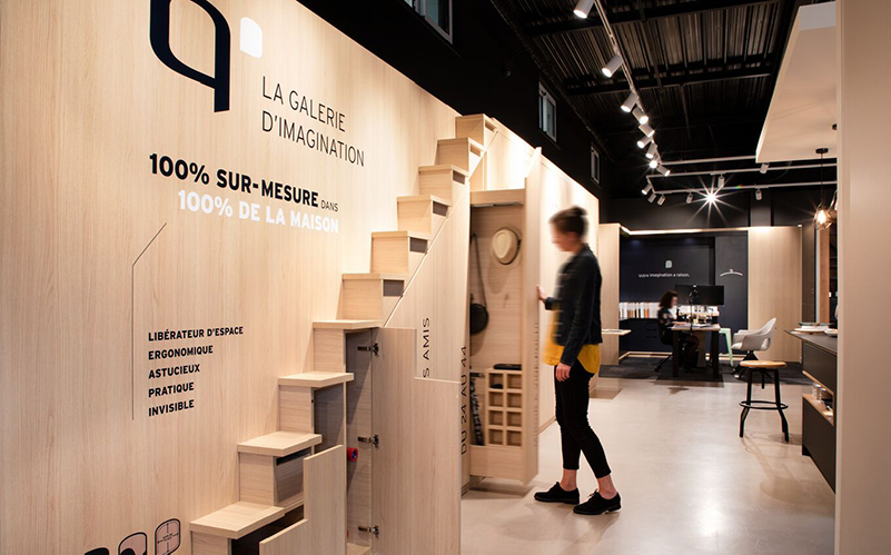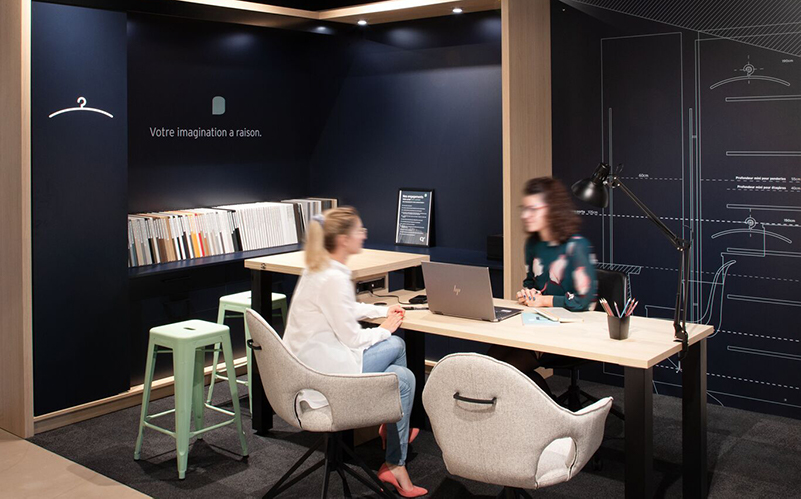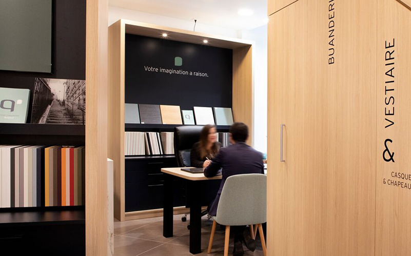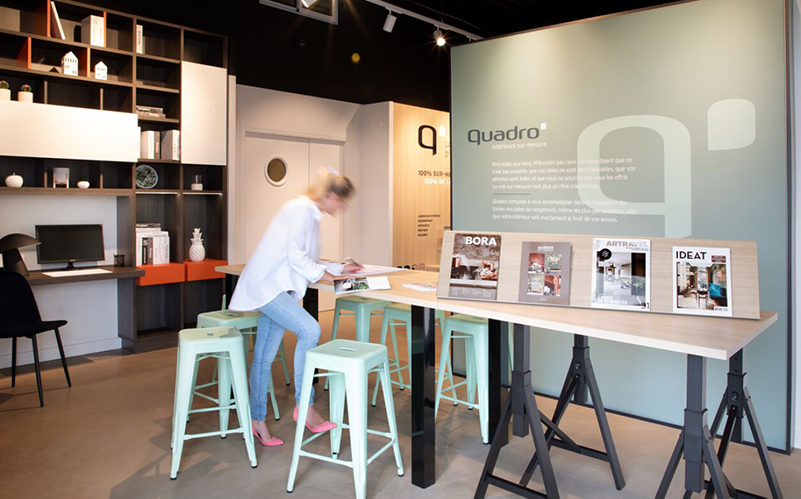 Qu’il soit implanté en centre-ville ou en zone commerciale, le concept intérieur des magasins Quadro propose un parcours et une expérience consommateur uniques. A la fois ludique et technique, il intègre des marqueurs forts tels que la Table des métiers, La Galerie d’Imagination ou encore le Bureau Concepteur. Autant d’éléments innovants conçus pour exprimer le savoir-faire de l’enseigne, inspirer et faciliter la co-création entre le client et son concepteur.